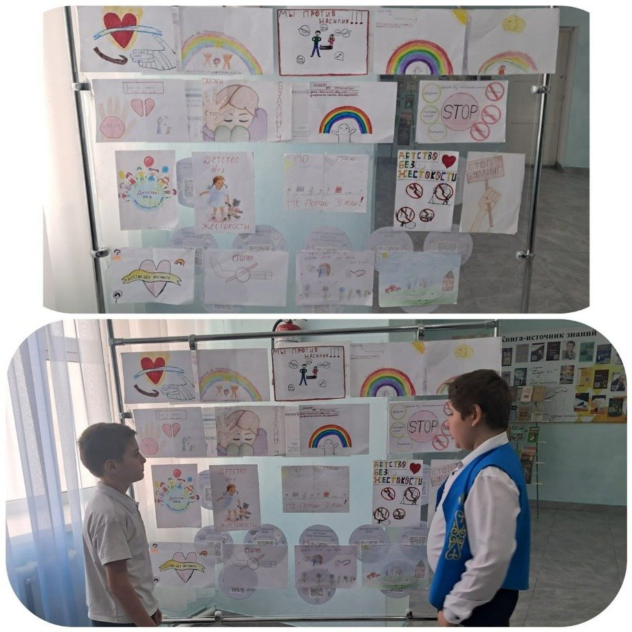 "Адал азамат" Бірыңғай тәрбие бағдарламасы, "ДОСБОЛЛИКЕ" білім беру ұйымында білім алушыларды қорлау/буллинг пррииоактикасы бағдарламасы және " буллингке жоқ деп айтайық!"Бала құқықтары туралы конвенцияға" орайластырылған іс-шараларда мектеп оқушылары "қатыгездік пен зорлық-зомбылықсыз балалық шақ"тақырыбында суреттер көрмесін дайындады.