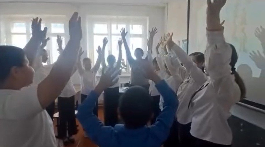 Дене шынықтыру мұғалімі Л. И. Ломова мектеп оқушылары мен педагогтар арасында дене шынықтыру жаттығуларын өткізді.