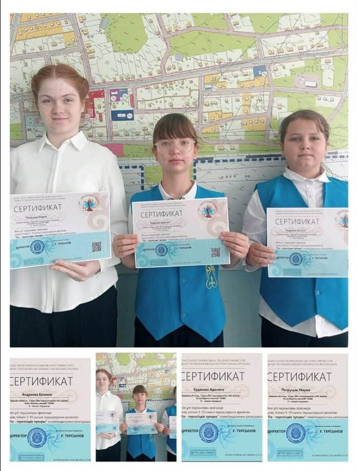 Қазақстан Республикасының оқу ағарту министрлігі “Дарын” Республикалық ғылым практикалық орталығы,Өзге ұлт оқушыларына арналған қазақ тілінен 5 - 10 сынып оқушыларына арналған “Тіл - тәуелсіздік тұғыры” олимпиадасына қатысып, келесі оқушылар сертификатпен марапатталды.
