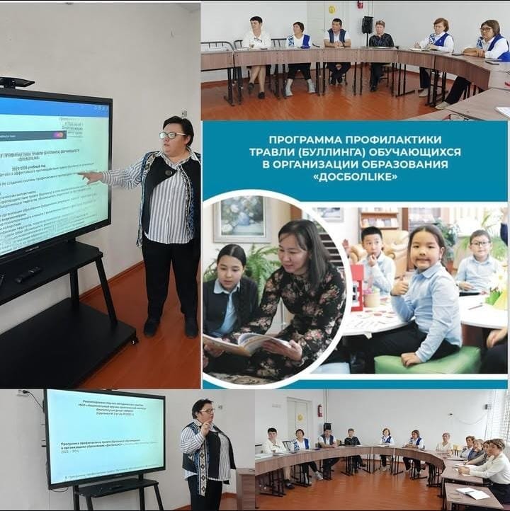 Мақсаты: "досболлике" білім беру ұйымдарында білім алушыларды қорқытудың (қорқытудың) алдын алу бағдарламасымен танысу НҚА-мен танысты, АК-ның әрбір қатысушысының іс-қимыл алгоритмін егжей-тегжейлі қарастырды, "мектеп буллингі туралы барлық шындық" ролигін және "бейбітшілік пен Гошу туралы"мультфильмін қарап, талқылады. Педагогтар "қауымдастық" жаттығуына қатысты. "Джефф + пікірталас" жаттығуының әртүрлі жағдайларын талқылап, "жанжалсыз және қорқытусыз салауатты қарым-қатынас"тақырыбында постер дайындады.