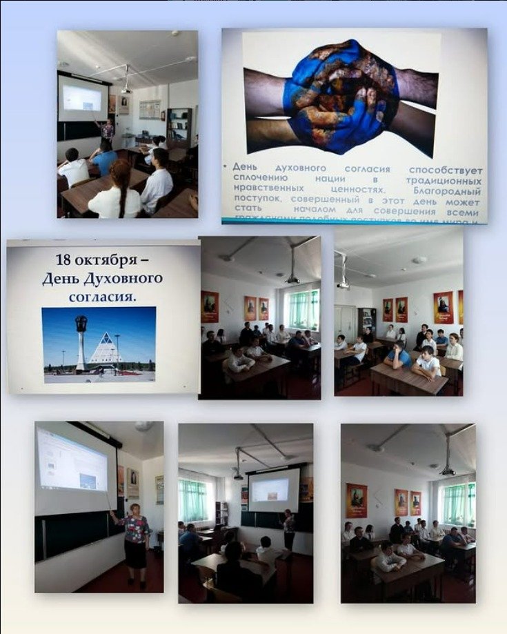 "Адал азамат" Бірыңғай тәрбие бағдарламасы аясында "бірлік пен ынтымақ" құндылығы, тарих пәнінің мұғалімі В. А. Абельдинова 5-11 сынып оқушылары арасында 18 қазан-Рухани келісім күніне орай ақпараттық әңгіме өткізді. Мақсаты: балаларда руханилықты, төзімділікті және әртүрлі ұлттардың, діндердің адамдарына құрмет көрсетуді дамыту. Құрдастар арасында достық қарым-қатынас орнатуға, аға буын өкілдеріне құрметпен қарауға үйрету.