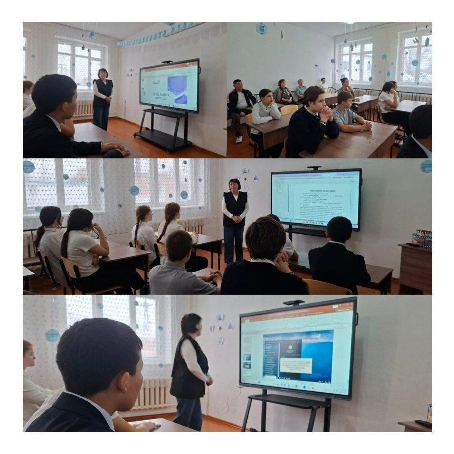 Мақсаты: Оқушыларға Қазақстанның еңбек нарығында сұранысқа ие мамандықтар туралы, Enbek порталында тіркелу және skills Enbek онлайн курсынан өту ережелері туралы айтып беру.